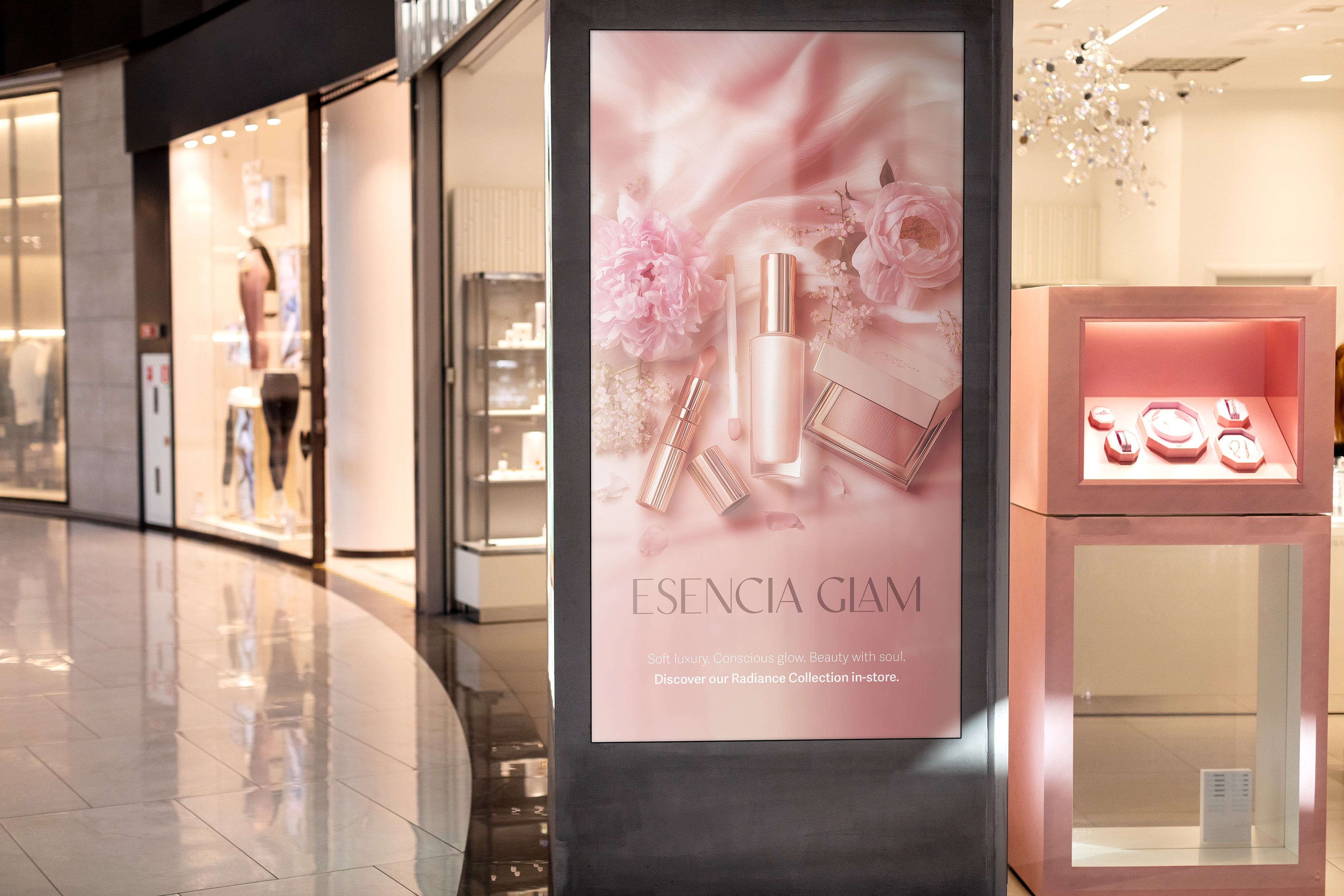 The creative direction focused on capturing radiance and fluid beauty. A palette of blush pinks, champagne golds, and iridescent tones reflects light like makeup itself, creating a sense of glow and movement. Elegant serif typography, paired with delicate, minimalist line work, evokes sophistication and sensuality.